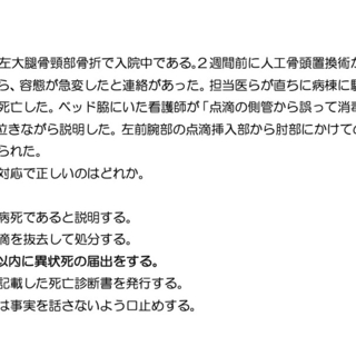 [a] 誤り。状況から、点滴ルートから消毒液を注入したことが原因となって死亡した可能性があります。少なくとも、死亡確認後にすぐ"病死"と判断してしまうのは早合点しすぎです。